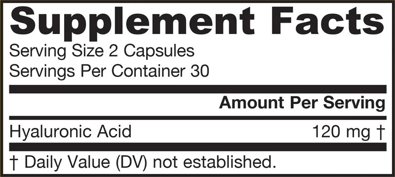 Acidul hialuronic amortizeaza socurile in articulatii dar are si efect de lubrifiere, hidratare si reparare a pielii. Acidul hialuronic ajuta sistemul imunitar, actionand ca si antioxidant si creste retentia de apa in tesuturi. Acidul hialuronic de la Jarrow Formulas este un preparat cu greutate moleculara mica obtinut prin biofermentare. Este documentat clinic ca sa fie biodisponibil si sa imbunatateasca hidratarea pielii. Aceasta substanta mai este folosita si pentru diminuarea ridurilor.