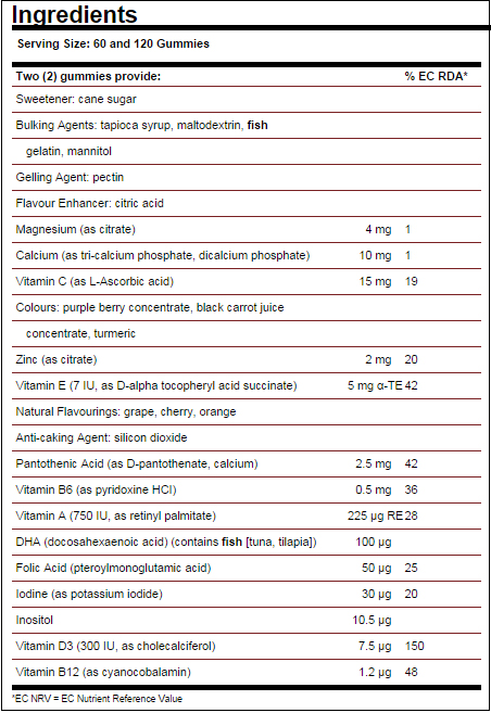 Continut: magneziu, calciu, vitamina C, coloranti naturali, zinc, vitamina E, arome naturale, acid pantotenic, vitamina B6, vitamina A, acid docosahexaenoic, acid folic, iod, vitamina D3, vitamina B12.