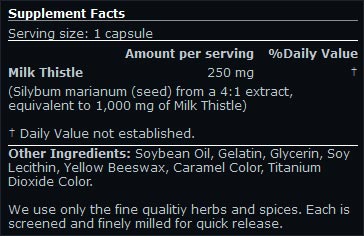 Silybum marianum (seed) from a 4:1 extract, Soybean Oil, Gelatin, Glycerin, Soy Lecithin, Coloring (Caramel, Titanium Dioxide).
