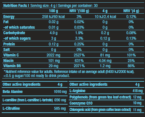 RECOMANDARE: se amestecă 4 g (1 lingură = 1 lingură de cafea) pulbere cu 200 ml apă cu 15 minute înainte de antrenament. Folosiți un agitator pentru amestecare.