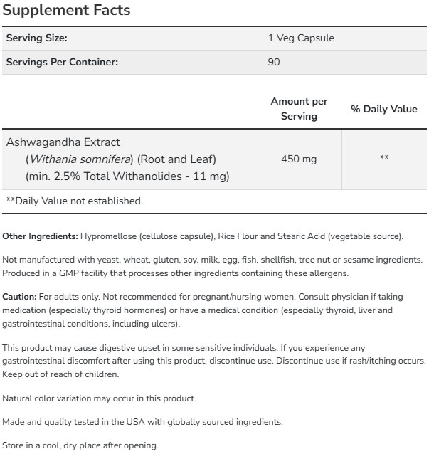 NOW Ashwagandha Extract 450mg / 180Vcaps.