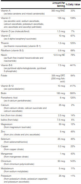 Alte ingrediente: Acid stearic, croscarmeloză sodică, acoperire cu peliculă apoasă (apă purificată, hidroxipropil metilceluloză, polietilenglicol), silice, stearat de magneziu, carbonat de calciu, granule de beta-carotene (gelatină, lipide, sucroză, tocoferol mixt, palmitat de ascorbil) celuloză, acacia, maltodextrină, granule de vitamină D3 (amidon alimentar modificat, zaharoză, ascorbat de sodiu, trigliceride cu catenă medie, dioxid de siliciu, tocoferol dl-alfa), metilceluloză, lecitină de floarea-soarelui.