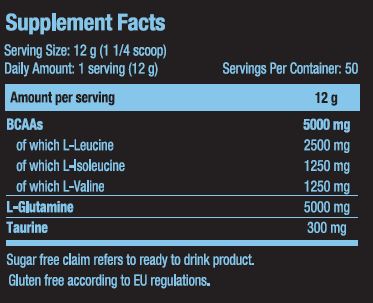 L-Glutamine, L-Leucine, L-Isoleucine, L-Valine, Flavors (Kiwi, Melon, Apricot), Taurine, Sweeteners (Sucralose, Acesulfame K), Acidity Regulator (Citric Acid Anhydrous), Colors (Riboflavin, Brilliant Green [Tartrazine*, Patent Blue V])*May have an adverse effect on activity and attention in children