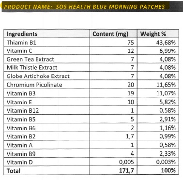 Tiamina (vitamina B1) 75 mg, vitamina C 12 mg, extract de ceai verde 7 mg, extract de cardi de lapte 7 mg, extract de anghinare 7 mg, picolinat de chimie 20 mg, vitamina B3 19 mg, vitamina E 10 mg, vitamina B12 1000 μg, vitamina B5 5 mg, vitamina B6 2 mg, vitamina B2 1,7 mg, vitamina A 1 mg, vitamina B9 4000 μg, vitamina D 5 μg.