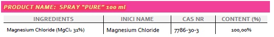 Uleiul pur de magneziu este un spray puternic concentrat de clorură de magneziu pur - nimic adăugat și nimic îndepărtat. Minat adânc sub suprafața pământului de pe fundul Zechstein din Olanda, poate fi folosit zilnic, nu este gras și nu lasă miros neplăcut. Oferă aproximativ 66 mg de magneziu elementar pentru fiecare 4 spray-uri sau 560 mg per linguriță.