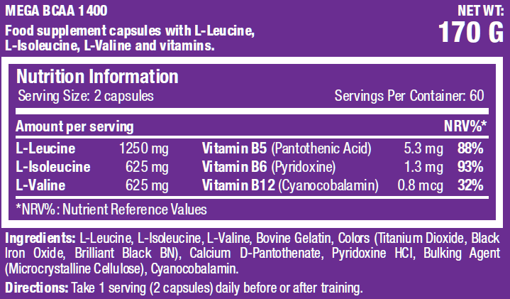 Mega BCAA 1400 este anabolic pentru că creşte sinteza proteică şi producerea de hormoni. Pe lângă asta mai este şi anti-catabolic, amino acizii BCAA scad descompunerea proteinei, şi asigură energie pentru celule.