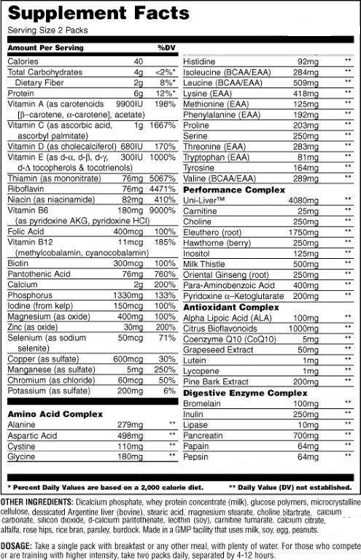 (0.600 Kg./1.322 lbs.)Animal Pak de la Universal Animal este un supliment multivitaminic complex, formulat pentru a sprijini sanatatea generala si performanta fizica a sportivilor si persoanelor active. Acest produs ofera o combinatie puternica de vitamine, minerale, aminoacizi si alte nutrienti esentiali, necesari pentru a mentine corpul intr-o stare optima de sanatate si pentru a imbunatati performanta in timpul antrenamentelor.
