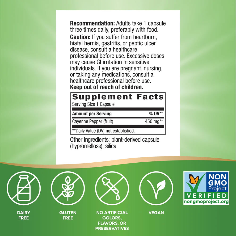 Condimentul vieții pentru îngrijirea sistemului cardiovascular – Ardeiul roșu iute este bogat în flavonoide naturale care susțin funcționarea sănătoasă a inimii. Nature's Way Cayenne conține 450 mg în capsule convenabile. Administrarea de capsule cu fruct de cayenne poate contribui la slăbire. Potrivit unui studiu al FDA din 1998, publicat în revista Advances in Therapy, pacienții care au utilizat un supliment ce conține ardei roșu iute împreună cu programul lor de alimentație și exerciții fizice au pierdut, în medie, cu 10% mai multe grăsimi subcutanate și și-au menținut mai mult masa musculară decât cei care au folosit doar dieta și exercițiile fizice.