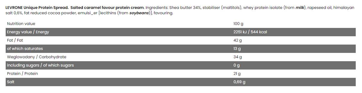 • Sursa echilibrata de macronutrienti: Pe langa proteine, Levro Unique Protein Spread ofera si un echilibru sanatos de grasimi si carbohidrati, asigurand un aport nutritiv complet.
