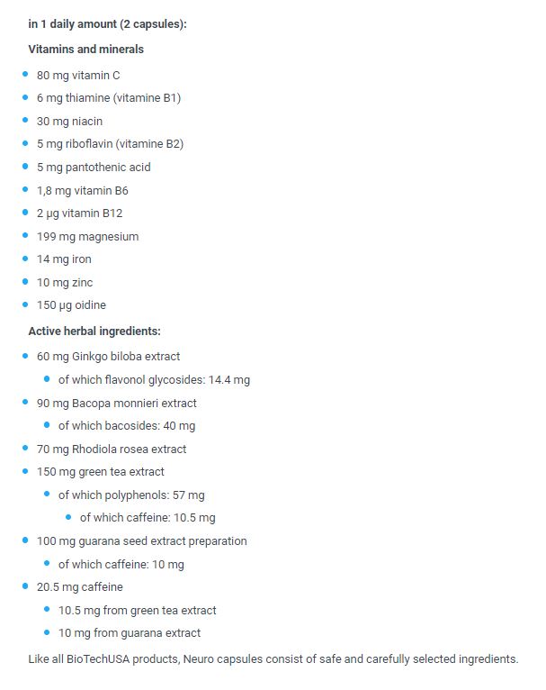 BIOTECH USA Neuro / 60 Caps conține o serie de vitamine și minerale care sprijină funcționarea normală a sistemului nervos și menținerea unei funcții psihologice și mentale sănătoase. De asemenea, conține ingrediente active pe bază de plante, precum extracte de Ginkgo Biloba, Rhodiola rosea și Bacopa monnieri. În plus, include cofeină din ceai verde și guarana.