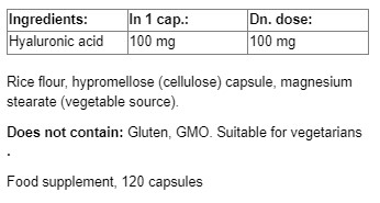 Acidul hialuronic din acest produs este obținut printr-un proces natural de fermentație, fiind astfel potrivit pentru vegani și mai biodisponibil decât acidul hialuronic obținut din surse animale sau sintetice. Fiecare capsulă conține 400 mg de acid hialuronic pur, ceea ce echivalează cu 425 mg de hialuronat de sodiu.