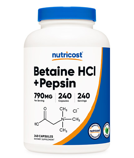 Ingredientele active principale din Betaine HCL + Pepsin de la Nutricost sunt betaina hidroclorid (HCL) și pepsina. Betaina este un compus care ajută la restabilirea acidității naturale a stomacului, esențială pentru digestia corectă. Ajută la descompunerea alimentelor, în special a proteinelor, asigurând digestia și absorbția completă a acestora.