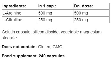 O combinație puternică de L-arginină și L-citrulină concentrată de la NUTRICOST, concepută pentru a crește semnificativ energia și rezistența prin creșterea nivelului de oxid nitric în organism. Această combinație este adesea preferată în locul suplimentelor „Pre-Workout” de către cei care doresc să limiteze consumul de cofeină, deoarece aceste două aminoacizi sunt componente esențiale în suplimentele cunoscute sub numele de „boostere de oxid nitric”.