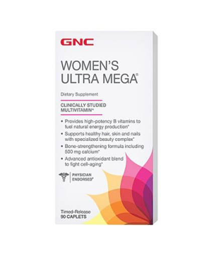 GNC Women's Ultra Mega este un supliment alimentar, cu o formula ultra puternica de vitamine si minerale pentru a asigura necesaru lzilnic al organismului femeilor. Acesta este un complex de bioflavonoide citrice, extract de papaya, pulbere de morcovi, spanac, ananas, afine, mere si multe alte ingrediente de specialitate, obtinut pentru a crea o sursa de multivitamine si antioxidanti cuprinzătoare pentru femeia activa. Excelentul supliment, oferă echilibrul perfect de vitamine, minerale, antioxidanti, extracte și ierburi, care completează dieta femeilor și sustine antrenamentele si activitatile zlnice.