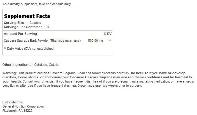 GNC Herbal Plus Cascara Sagrada este un supliment alimentar pe baza de extract de scoarta de Cascara Sagrada sau ''scoarta de copac sacru'', care are un extraordinar efect de imbunatatatire a sanatatii si functionarii sistemului digestiv. Acesta are o usoara actiune laxativa si este un antidot al problemelor hepatice.