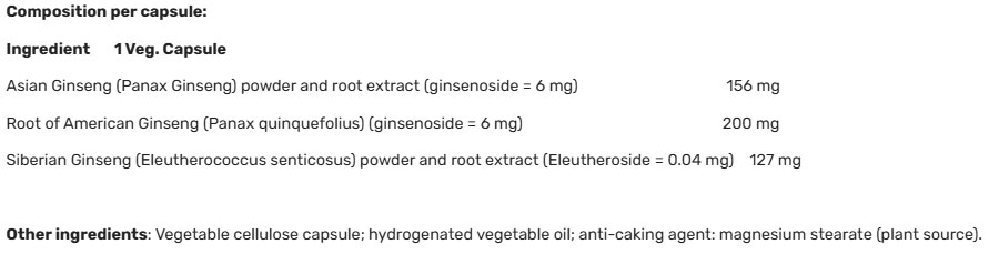 Continut: ginseng panax, ginseng american, ginseng siberian, celuloza vegetala.