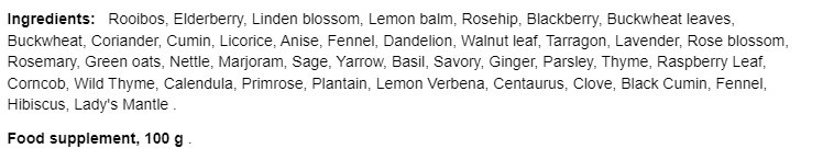 Ingrediente: Rooibos, soc, flori de tei, roiniță, măceșe, frunze de mur, frunze de viță de vie, hrișcă, coriandru, chimion, lemn dulce, anason, mărar, păpădie, frunze de nuc, tarhon, lavandă, flori de trandafir, rozmarin, ovăz verde, urzică, maghiran, ceai de grădină, coada șoricelului, busuioc, cimbru, ghimbir, pătrunjel, cimbru sălbatic, frunze de zmeură, mătase de porumb, cimbru sălbatic, gălbenele, primula, frunze de pătlagină, verbină lămâioasă, centaurea, cuișoare, chimen negru, mărar, hibiscus, mantaua doamnei.
