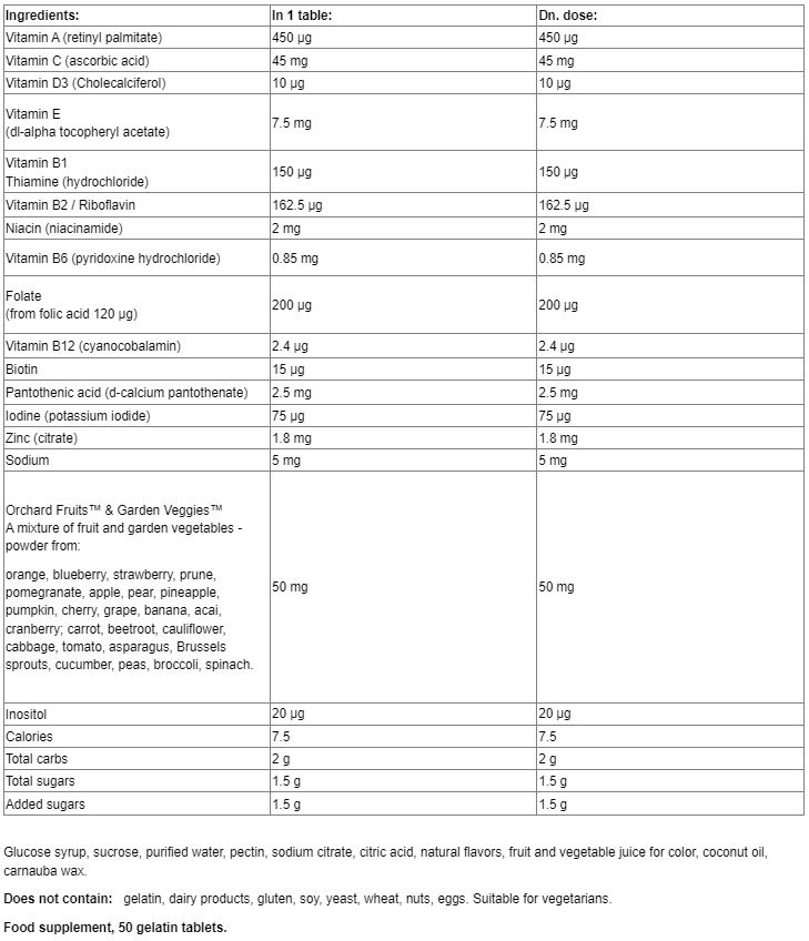 Ingrediente: Vitamina A, Vitamina C, Vitamina D3, Vitamina E, Vitamina B1, B2, B6, B12, Folat, Biotină...