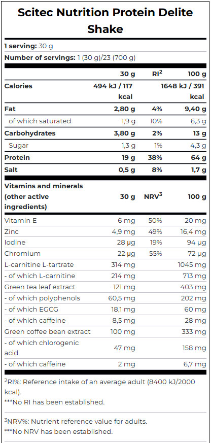 (0.500 Kg./1.101 lbs.)Protein Delite Shake de la marca SCITEC este un supliment alimentar delicios si nutritiv, ideal pentru cei care doresc sa isi mentina masa musculara si sa se bucure de un gust savuros in acelasi timp. Acest shake proteic ofera o combinatie echilibrata de proteine de inalta calitate, carbohidrati si grasimi sanatoase, toate intr-un singur produs usor de preparat. Protein Delite Shake este perfect pentru a fi consumat dupa antrenament sau ca o gustare sanatoasa intre mese.