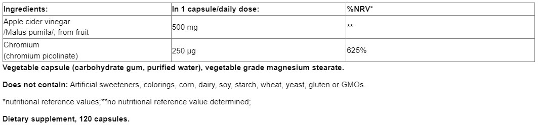 Apple Cider Vinegar 500 mg + Chromium 250 mcg / 120 Vcaps