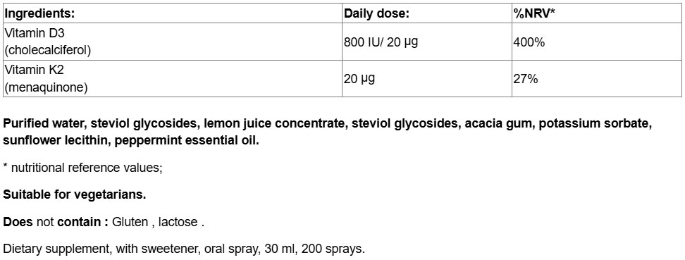 Vitamins K2 (20 µg) + D3 (800 IU) Mouth Spray / 30 ml