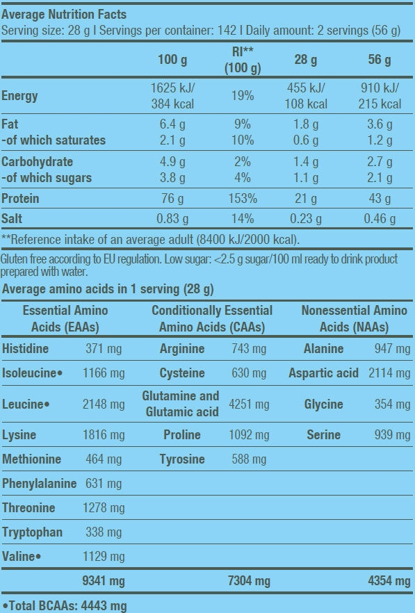 Aceste date se referă la versiunile aromate, versiunea fără aromă conține 4,8 g BCAA pe porție.