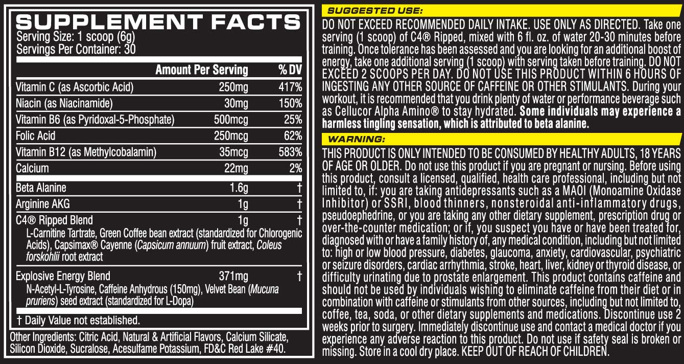 CELLUCOR C4 Ripped / 30serv.     C4 Ripped este un supliment pre-antrenament care combină energia explozivă a C4 cu ingrediente specifice pierderii de grăsime. Această formulă vă ajută să vă antrenați mai greu &icir ...