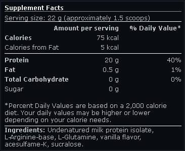 Undenatured Milk Protein Isolate, L-Arginine Base, L-Glutamine, Flavor (Vanilla), Sweeteners (Acesulfame K, Sucralose)