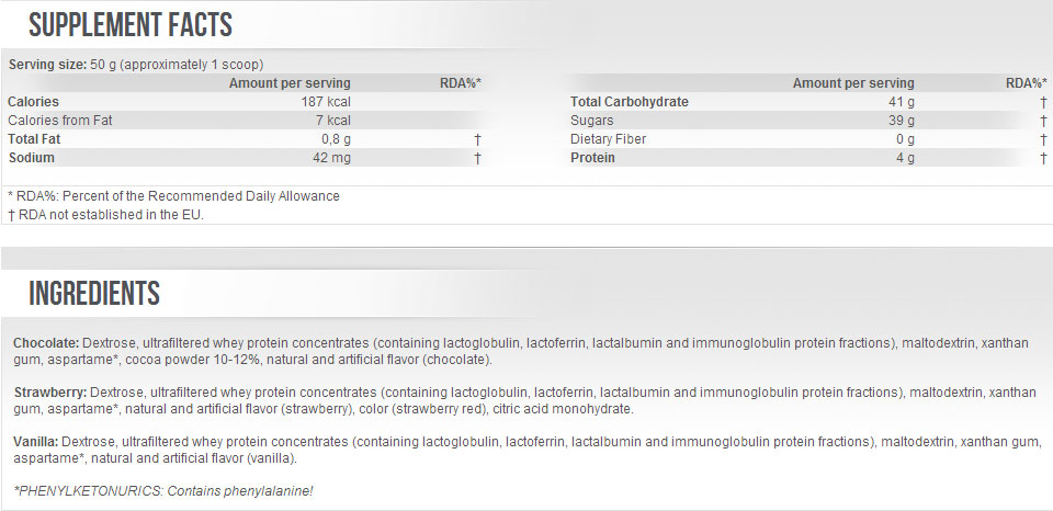 Contine si creatina, care mai creste performanta dar trebuie sa fii atent daca vrei sa-l combini sau iei si alta creatina. O doza buna de carbohidrati rapizi imediat dupa antrenament, intre mese sau dimineata. se recomanda 2-3 doze pe zi, eu am 95 de kg si cu 3 doze zilnic ma refac foarte bine.