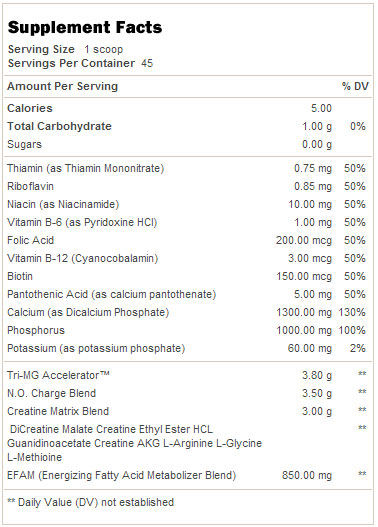 Suplimentul contine cea mai puternica si intensa forma creatina - clorhidrat de creatina. Acesta este absorbit mult mai bine și mai repede din organism, creste forta si rezistenta si promovează, de asemenea, construirea masei musculare. In plus, ajută inima și are efect liniștitor asupra sistemului nervos. Clorhidratul de creatina creste performanta muschilor, neutraliza acidul lactic și reduce sentimentul de rigiditate dupa antrenamente intense.