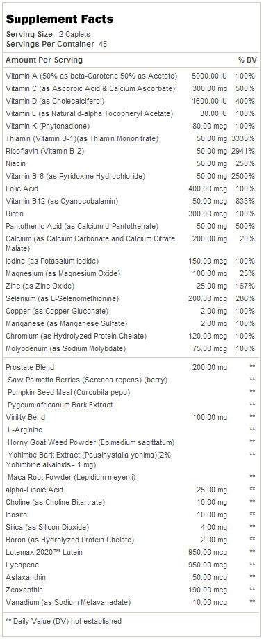 GNC Mega Men Prostate & Virility contine aminoacidul arginina, care imbunatateste sanatatea sexuala, participă la construirea tesutului muscular, întărește sistemul imunitar și contracareaza efectele negative ale radicalilor liberi. Mai mult decât atât, arginina promovează eliberarea hormonului de creștere și creșterea producției de insulină.