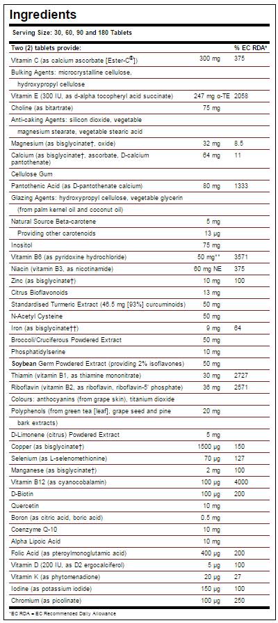 SOLGAR Omnium conține, de asemenea, beta-caroten natural, o forma coenzima de vitamina B, vitamina C și metaboliții săi, curcuma, izoflavone, tocoferoli, polifenoli, bioflavonoide, proantocianidine, extracte de citrice, coenzima Q10, alfa lipoic Acid, quercetin, și altele asemenea. Mai mult decât atât, formula este potrivita pentru vegetarieni.
