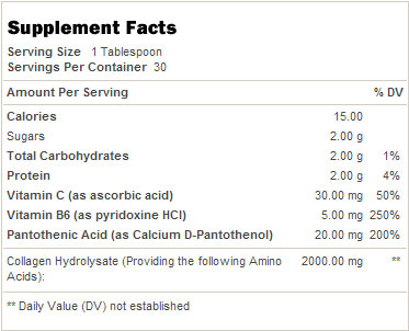 Formula GNC RejuviCare™ Collagen Beauty Formula este imbogatita cu vitamina C, care reduce liniile fine, creste elasticitatea pielii si imbunatateste aspectul acesteia. Vitamina C stimulează producția de colagen si are proprietatea de a reducere petele de pe piele. In compozitia suplimentului se adaugă și vitamina B5 (acid pantotenic), care stimulează metabolismul, creste energia necesară în timpul activităților intense, intareste imunitatea și îmbunătățește activitatea creierului. B5 este o vitamina solubila in apa, esențială pentru sinteza de proteine, grăsimi și carbohidrați.
