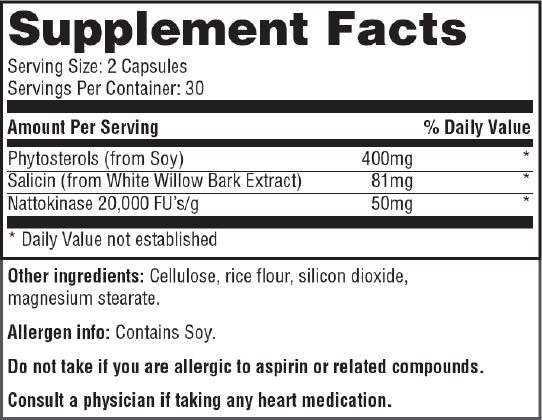 Formula noastra, Heart-Cholesterol Support, conține 400 mg de fitosteroli, precum și salicin, un anti-inflamator natural agent similar cu aspirina, și nattokinase, o enzimă folosită în mod tradițional pentru a sprijini fluxul de sange sanatos si pentru a minimiza sansele de a dezvoltaboli de  inima si boli vasculare.