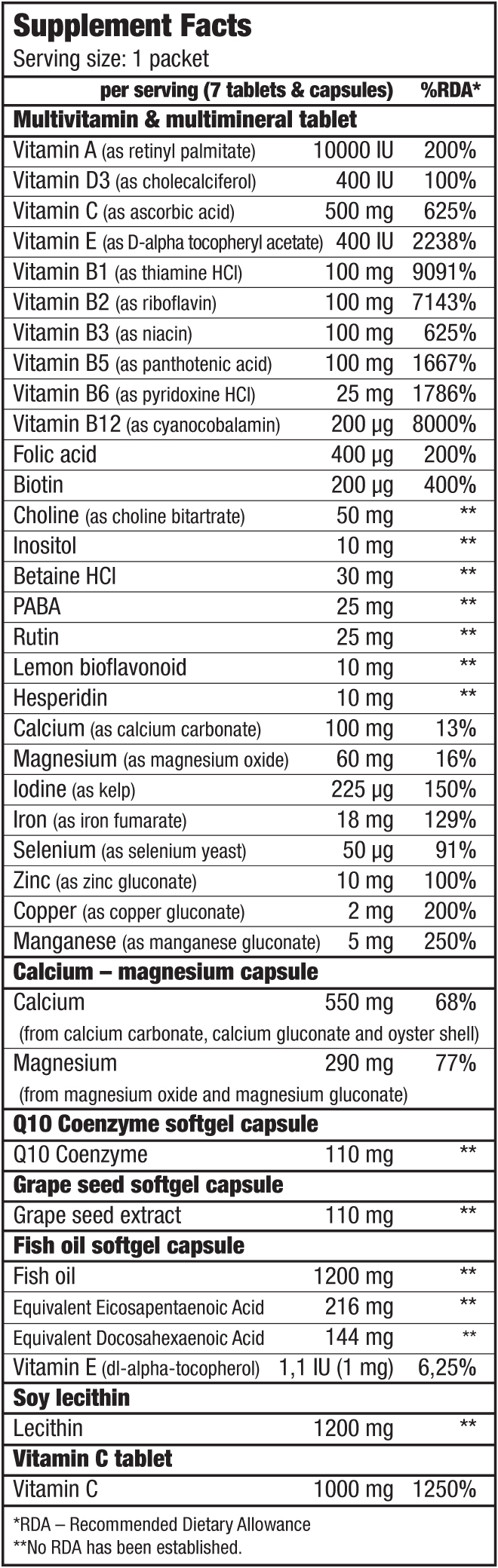 BIOTECH USA Daily Pack conține minerale esențiale, cum ar fi magneziu, calciu, fier, iod, coenzima Q10, extract de seminte de struguri si capsule gelatinoase de ulei de peste. Deasemenea, mai conține si lecitină din soia, o sursa bogata de colină, care sprijina sanatatea ficatului, viteza de recuperare, promovează sistemul nervos și poate promova pierderea in greutate.